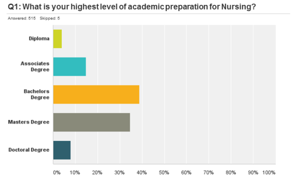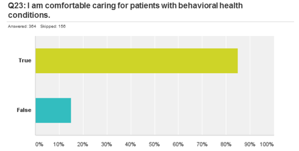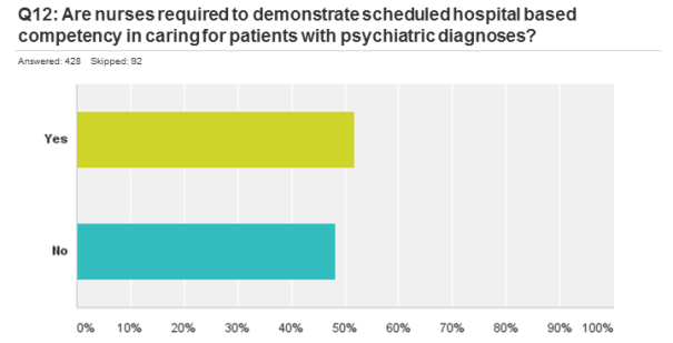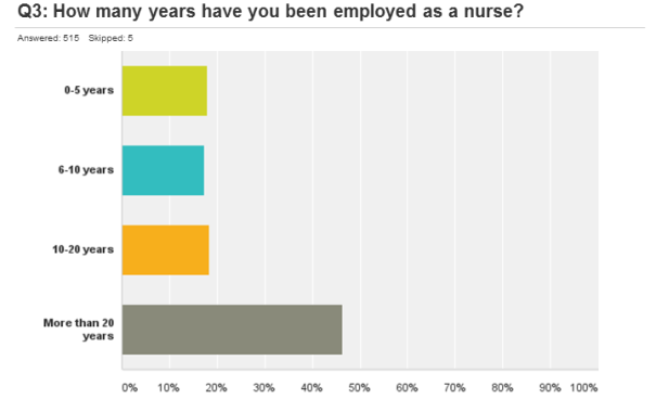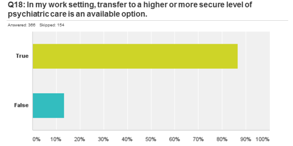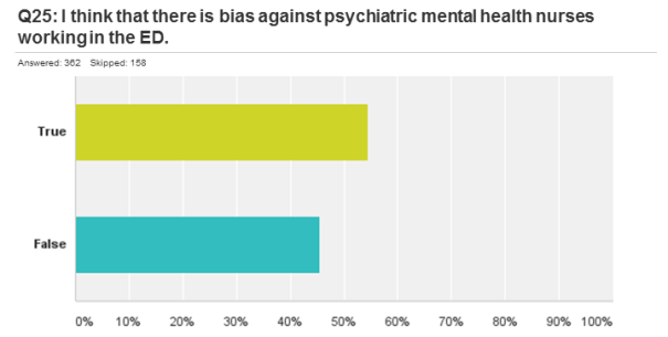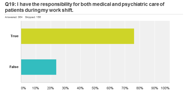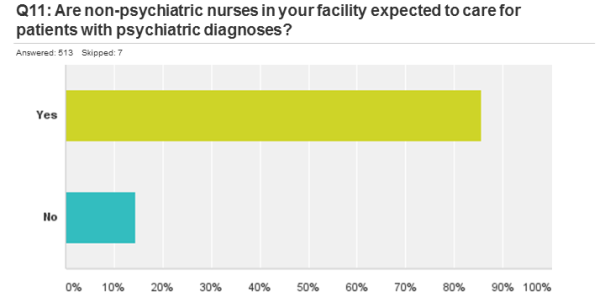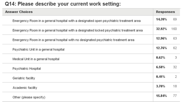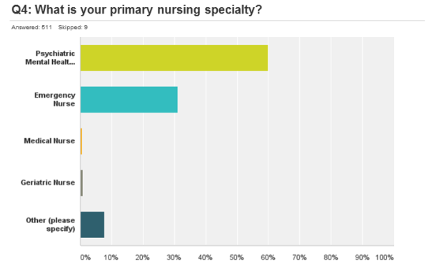 The workgroup, which sought to determine the role of the psychiatric-mental health nurse in the Emergency Department, used APNA organizational channels to bring their needs to the attention of the Board of Directors. In January of 2014, the group submitted a briefing paper to the APNA Board of Directors asking for approval to survey the membership. “This grassroots group has identified the need to define the role of the psychiatric nurse in emergency rooms and to develop competencies for nurses that practice in these settings,” they stated in the briefing paper. “The group would like to begin by surveying APNA members in an effort to discover how psychiatric nurses who work in emergency room settings define their roles.” The Board supported the project and approved the final 25-question survey in April 2015. Workgroup members Michele Heyland and Gale Sullivan summarized the 519 responses. (Scroll down for select summaries.)