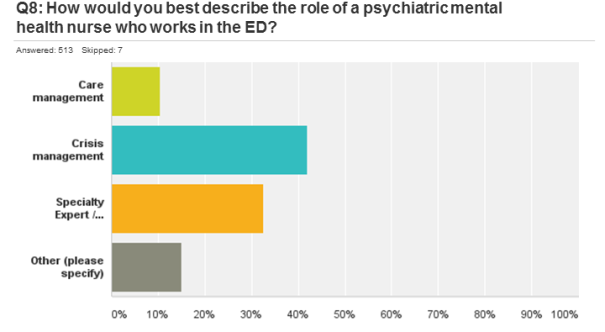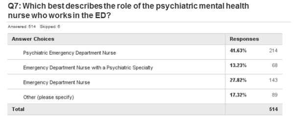 More than half of the respondents identified themselves as psychiatric-mental health nurses, while one third identified themselves as emergency department nurses. Demographic data showed the majority of respondents to be highly educated and experienced, practicing in mostly urban settings, and trained in and comfortable with providing care to individuals with psychiatric-mental health needs. Consensus was shown around a title of psychiatric emergency department nurse with a primary role of crisis management, for psychiatric-mental health nurses providing care in the Emergency Department.