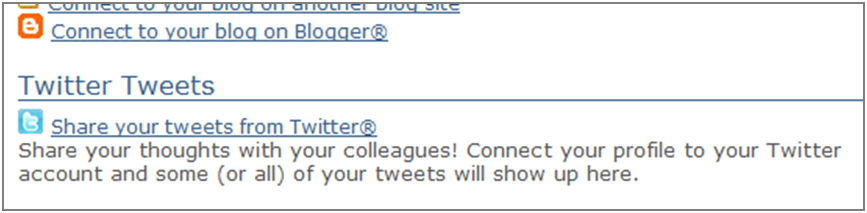 On the My Profile page, scroll down to the Twitter Tweets section and click on the Share your tweets from Twitter link: