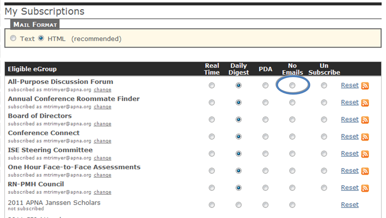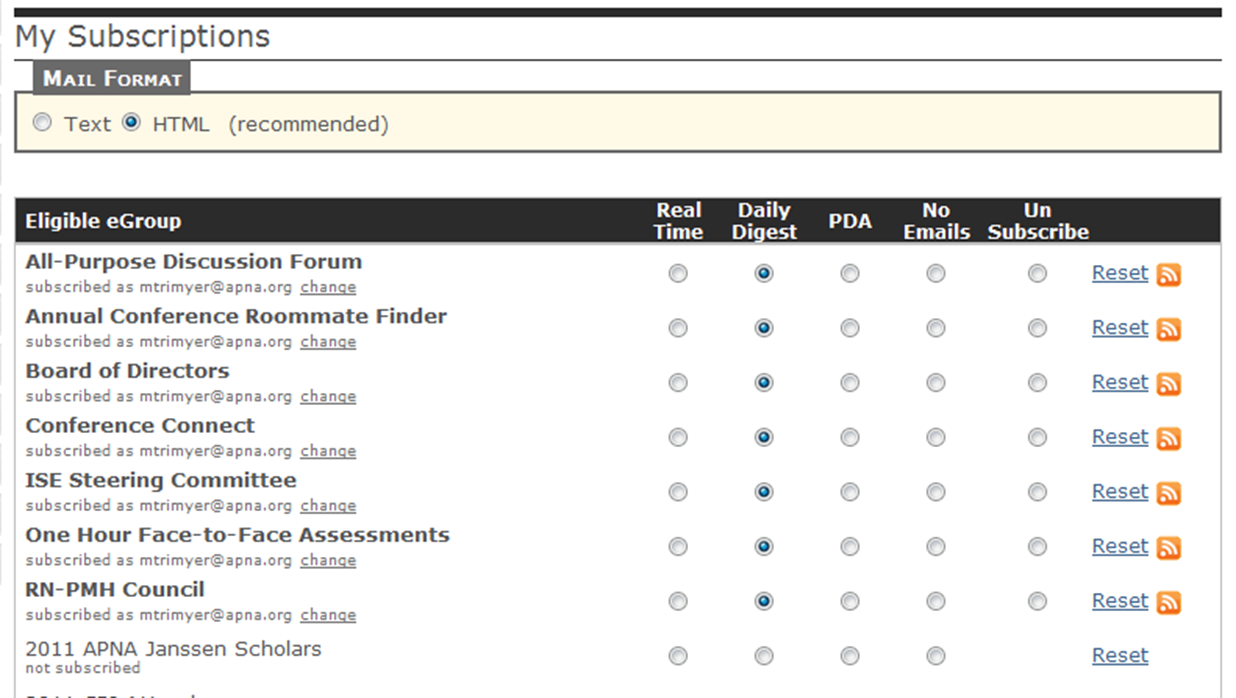 • You have a variety of options to choose from when editing your subscriptions: Real Time, Daily Digest, PDA, No Emails. The Real Time setting means that you will receive an email every time a message is posted to the eGroup. With the Daily Digest option, you receive one email every day that includes all of the messages posted to that eGroup within the past 24 hours. PDA is similar to the Daily Digest option, the only difference being that your daily digests will be sent in a plain text format. When you select No Emails, you can still access the eGroup's content by logging in to Member Bridge, but you will be sent any email notifications. Finally, to leave an eGroup, select Unsubscribe. (Remember that the Unsubscribe option will not work for the All-Purpose Discussion Forum. To stop the daily digest emails from the All-Purpose Discussion Forum, select No Emails.)