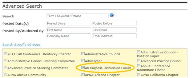 A table of all of the eGroups to which you have access will appear. Check the name of the group you would like to search: